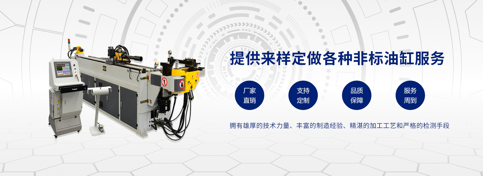 本公司主要生产销售弯管机、缩管机、铝型材切割机、倒角机、滚圆机等产品,同时生产各种规格的液压系统,液压油缸、液压电磁阀,定做非标液压系统。提供来样定做各种非标油缸服务。